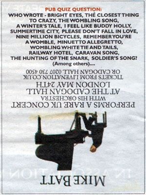 This advert appeared in the London Evening Standard newspaper on Friday, 7 May. It reads: Pub quiz question: Who wrote – Bright Eyes, The Closest...